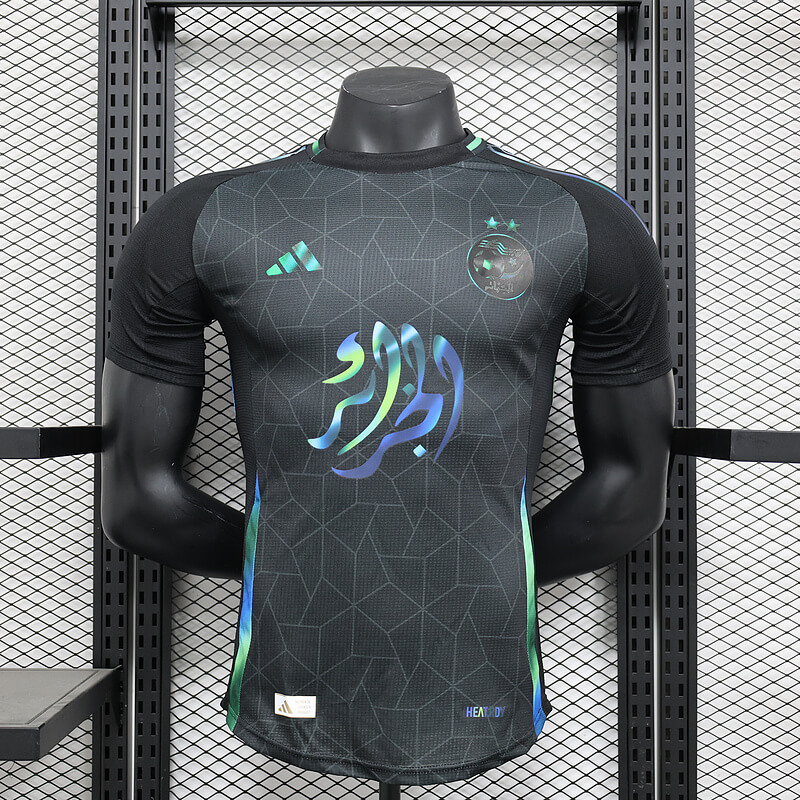 The subtle yet vibrant green and blue trims along the sides and sleeves reflect the national colors of Algeria, adding a dynamic touch to the jersey’s overall design.