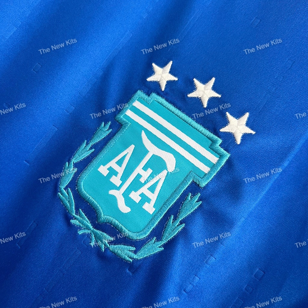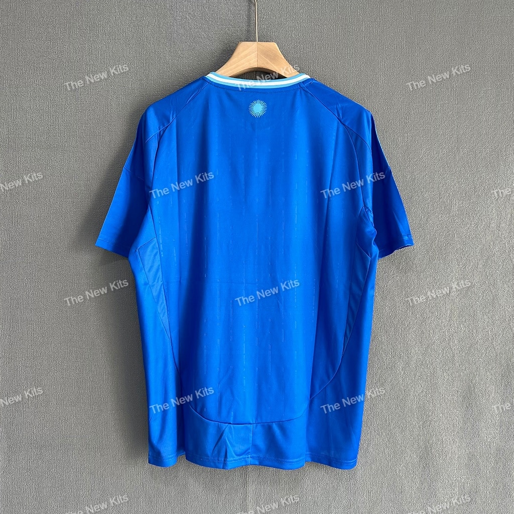 The Argentina away football kit features a bold royal blue base that recalls iconic designs from past decades, especially the 1990s. Sky blue and white accents run along the shoulders and sides, representing Argentina’s national colors. These subtle yet impactful details add depth to the kit, celebrating the Argentine flag’s colors.