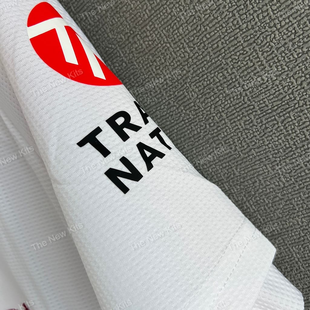 The Aston Villa 24/25 away kit features a crisp white base, complemented by the iconic claret and blue stripes on the collar and sleeve cuffs. These colors have long been associated with the club, and their presence in a more minimal form gives the kit a clean, modern look while staying true to Villa’s heritage. The kit also displays the special ‘AV 150’ anniversary logo in elegant script, marking a century and a half of the club’s storied history.