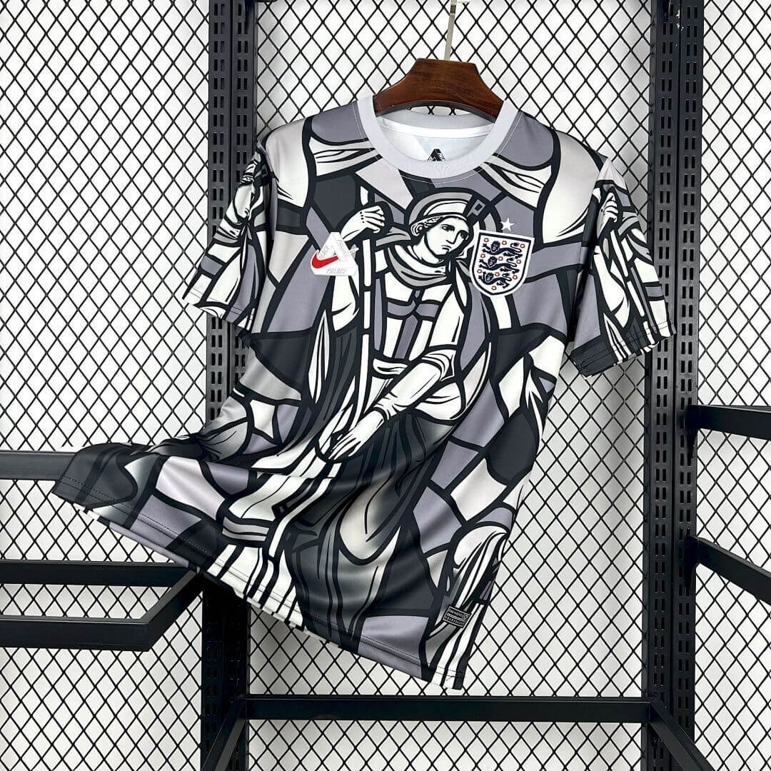 The england palace kit features a sophisticated “Grey & Silver” grayscale palette for a sharp, authoritative silhouette. 🛡️ Specifically, the design showcases a stunning, all-over stained-glass graphic depicting St. George, the patron saint of England. This artistic approach provides a bold update to the england shirt 2024 lineage while maintaining a historic identity. ✨