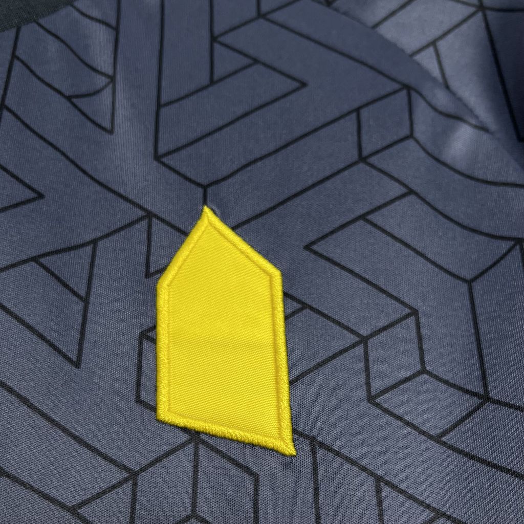 This edition blends athletic performance with a nostalgic edge, ensuring both players and fans can wear the kit with pride. The yellow detailing on the collar and socks complements the dark base, creating a visually striking contrast.