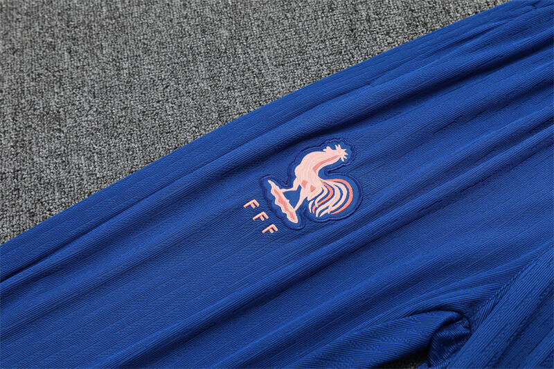 Train like Les Bleus in the france Football Tracksuit for the 2025/26 season. This two-piece Nike set pairs a long-sleeve quarter-zip top with matching tapered pants in classic France blue with sleek pastel-rose shoulder and calf inserts. The proud FFF rooster crest stands over the heart, delivering instant Clairefontaine energy for warm-ups, gym work and travel days.