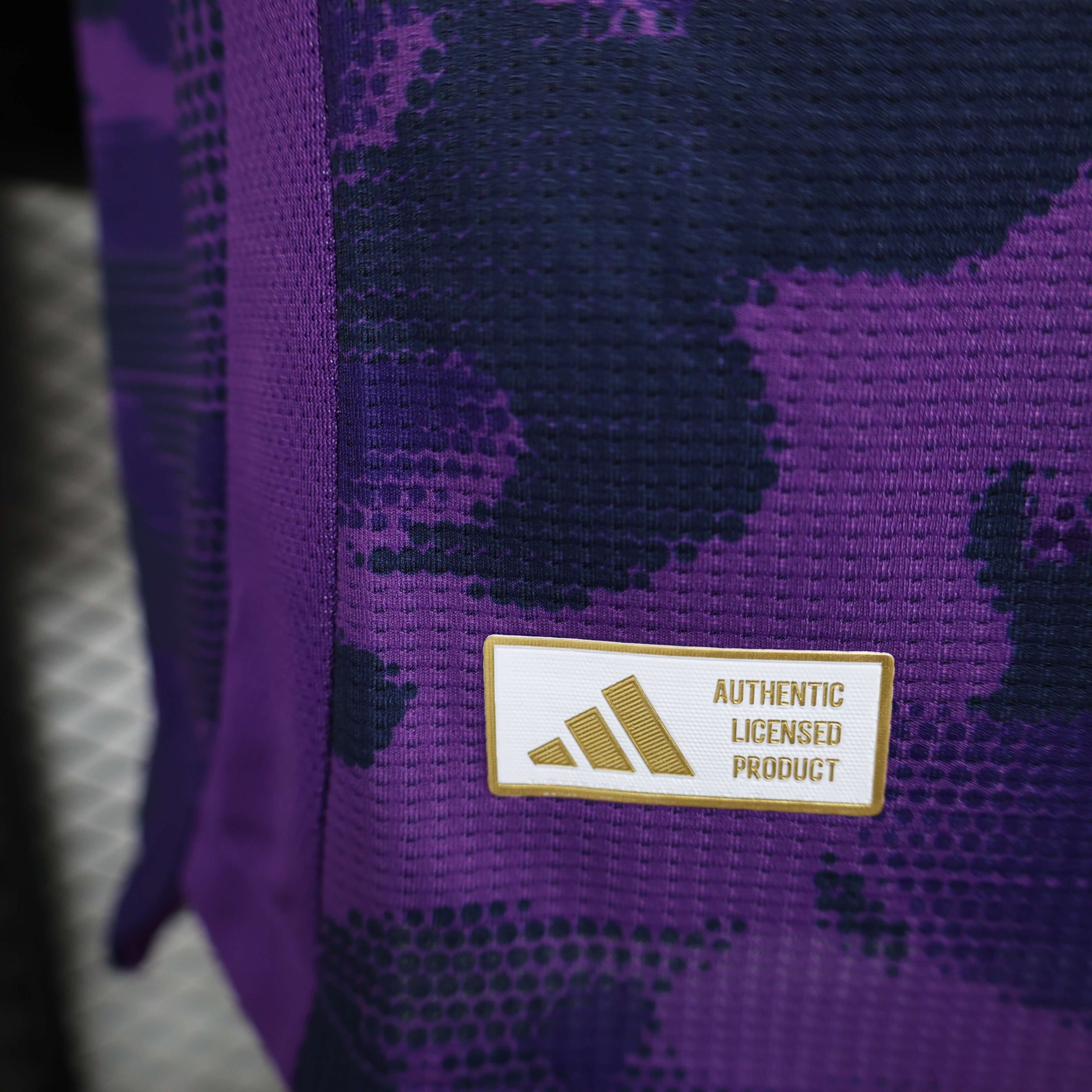 The Fulham 24/25 third kit is predominantly purple, with a darker purple camouflage graphic spread across the front. This unique colorway adds depth and visual interest, setting it apart from traditional football kits. The design, previously seen in other Adidas teams’ kits, brings a contemporary and edgy touch, reflecting the club’s ambition and modern spirit. Accents, such as the Adidas logo and sponsor branding in contrasting white, enhance the overall look, providing balance to the vibrant color scheme.