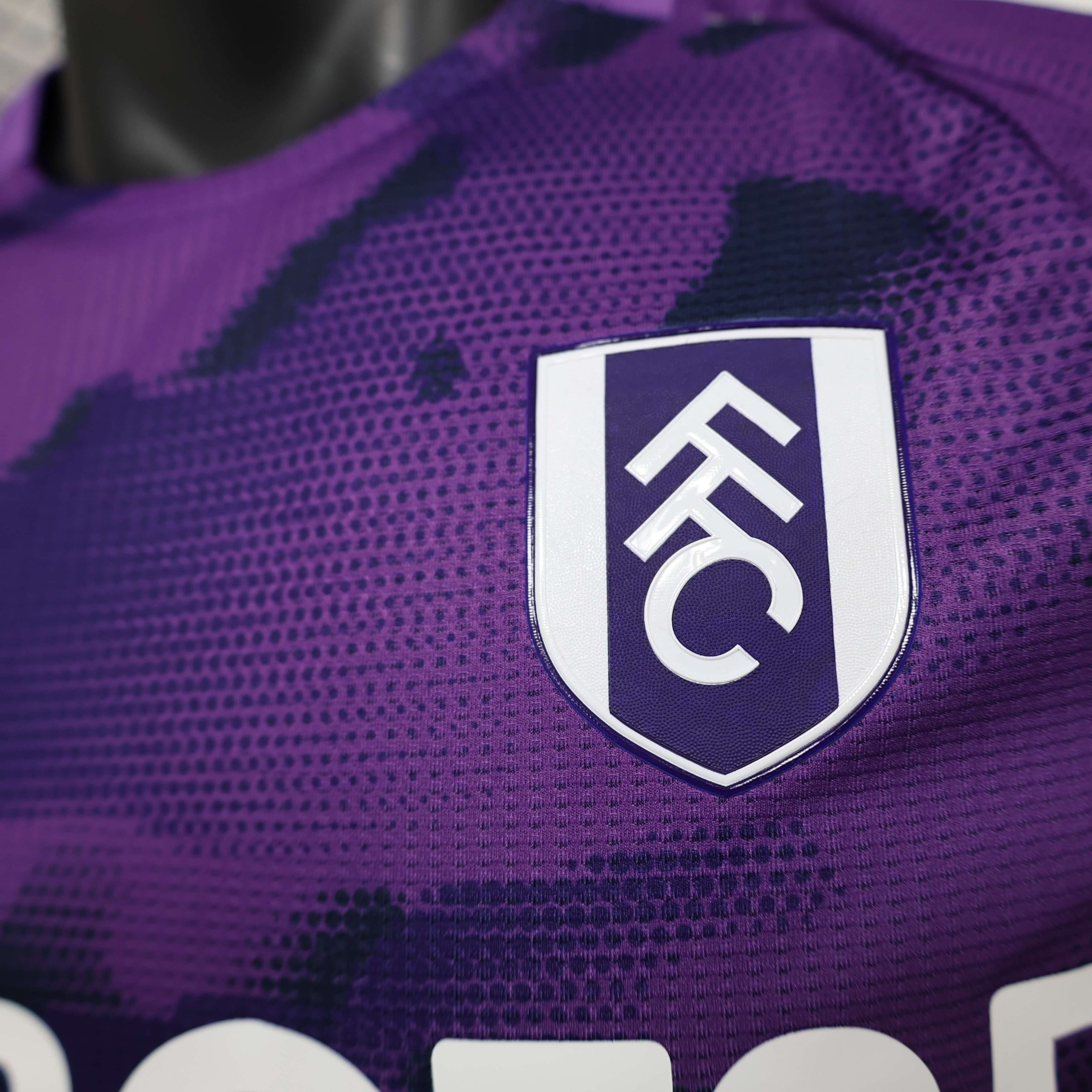 This Fulham 24/25 third kit is complemented by matching purple shorts and socks, both featuring subtle white accents to tie the entire look together. The coordinated ensemble reinforces the bold yet cohesive theme, making it a standout set that is unmistakably Fulham.