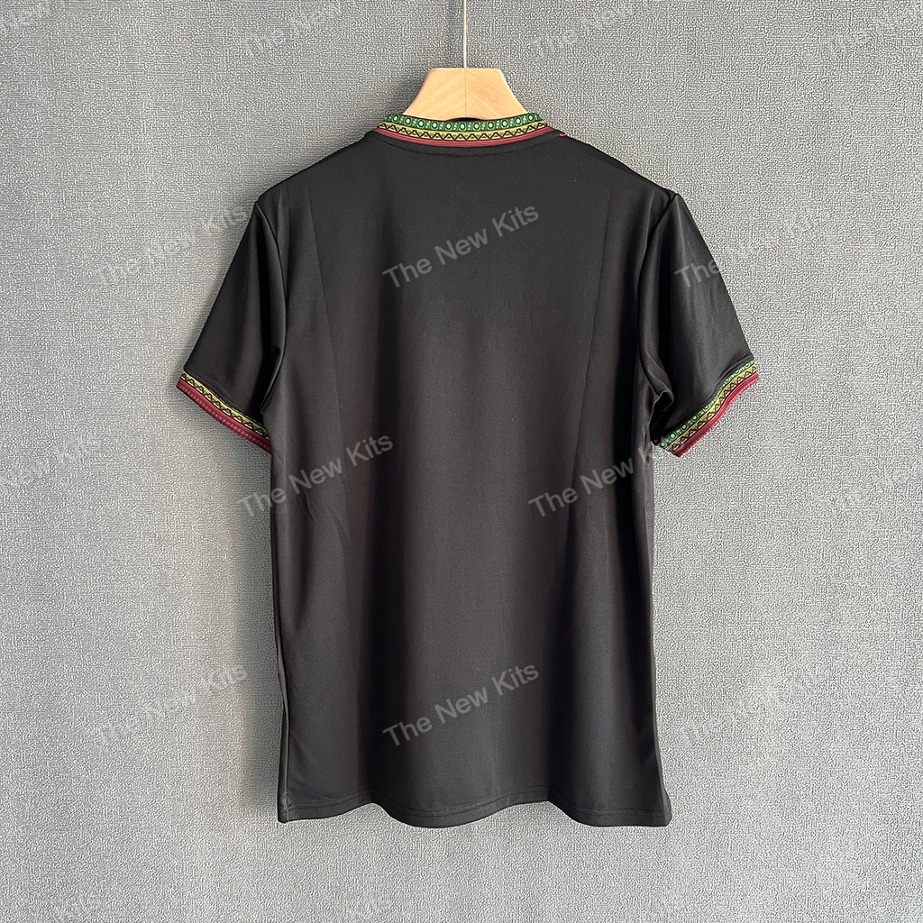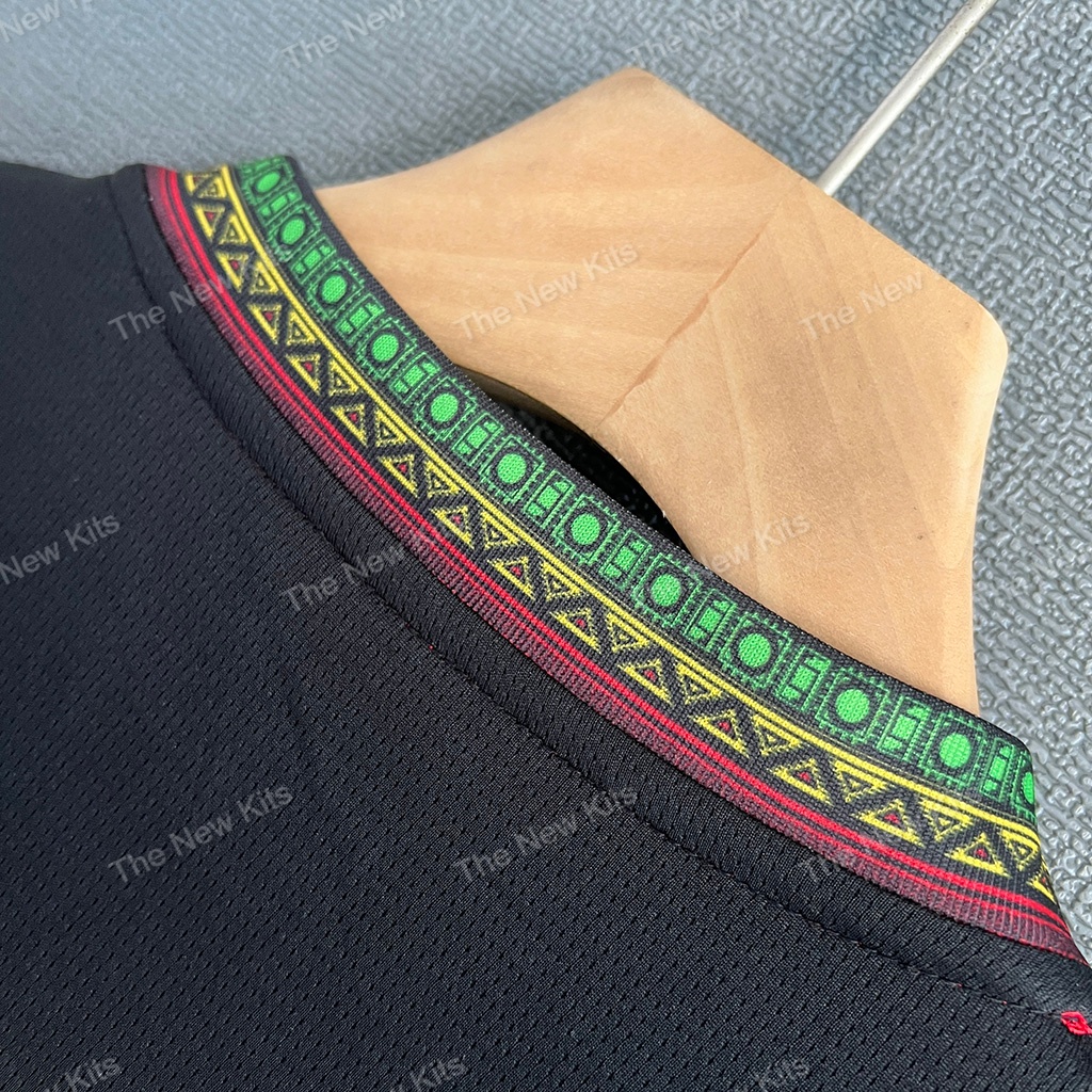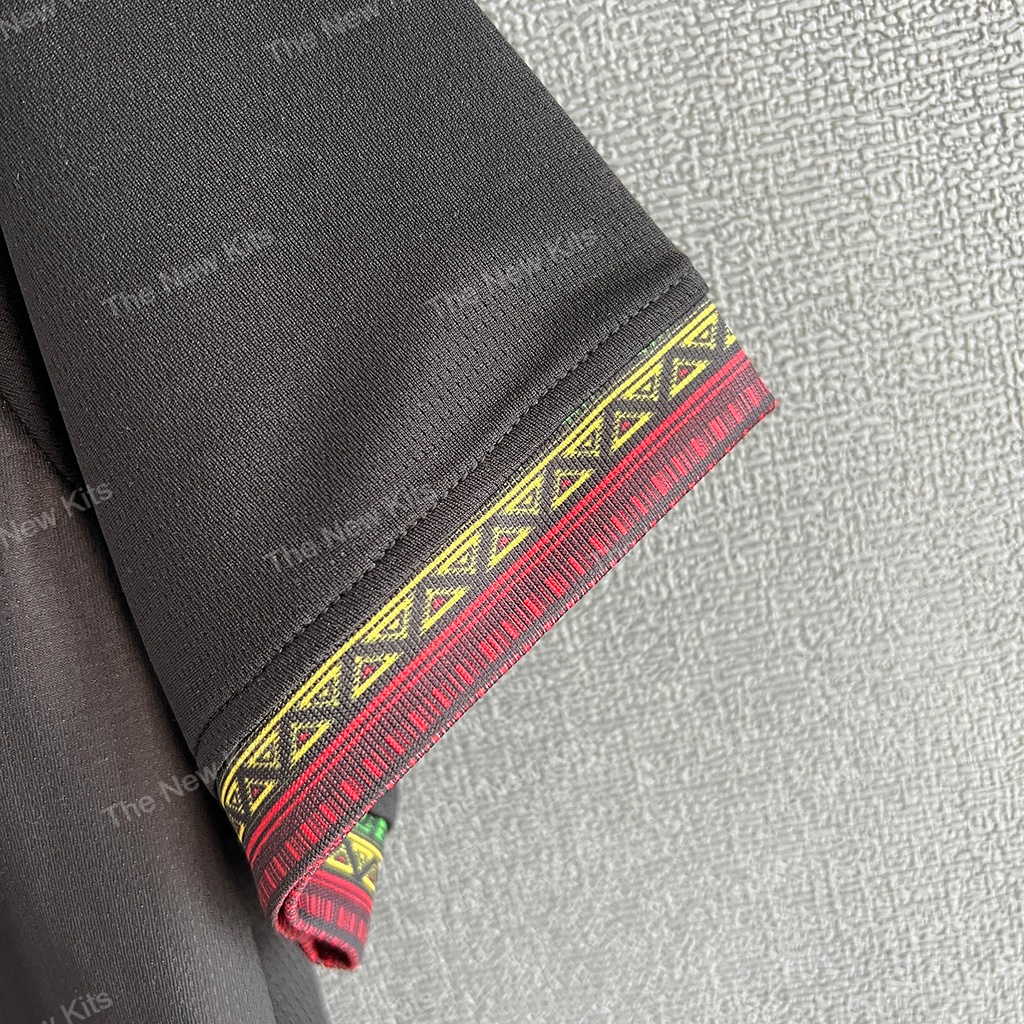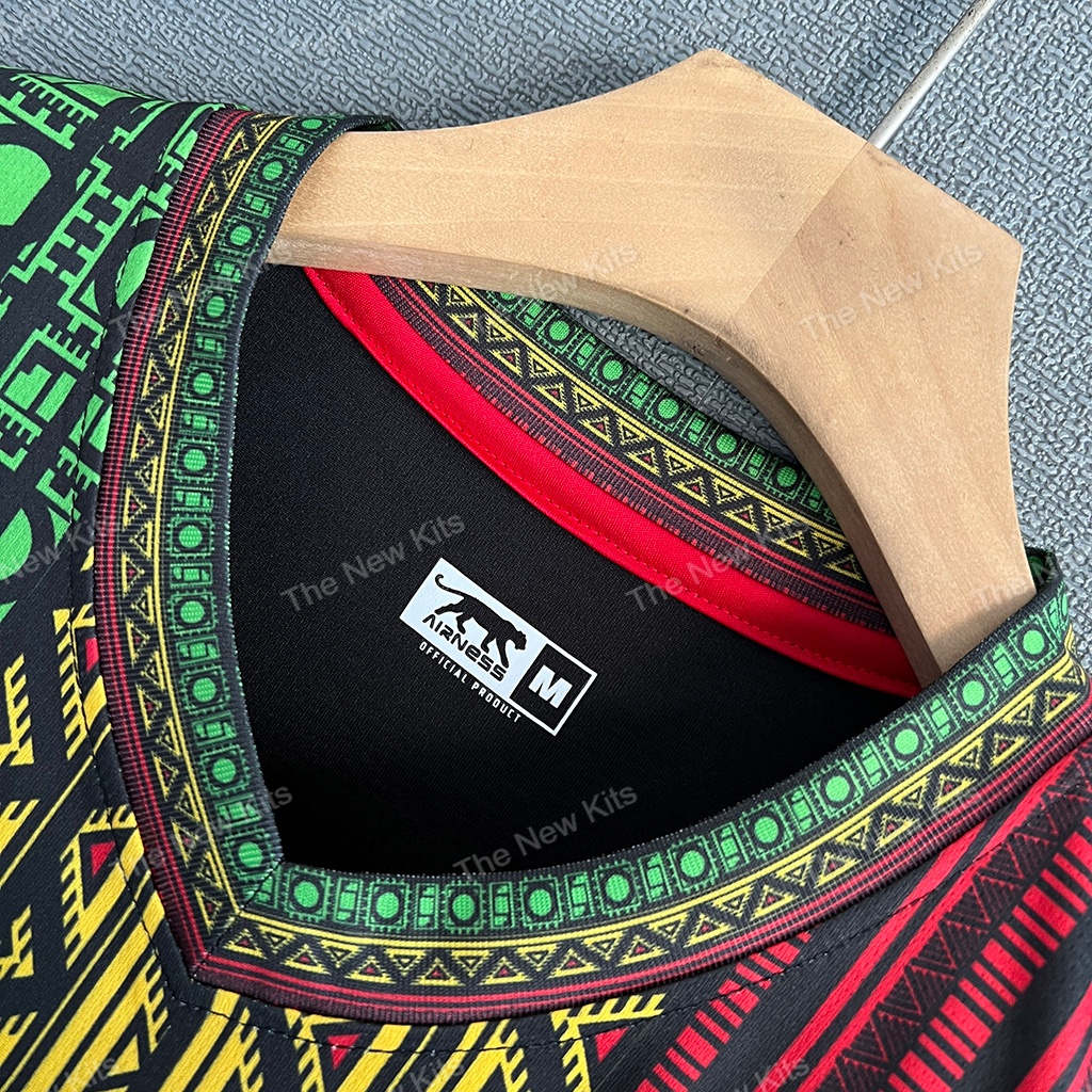 The Mali 2024 third kit stands out with its black color, complemented by green, yellow, and red accents—reflecting the national colors of Mali. These accents are applied to the sleeves and collar, adding a dynamic contrast to the shirt’s dark base. The design stays consistent with Mali’s other kits for the season, ensuring a cohesive identity across all versions.