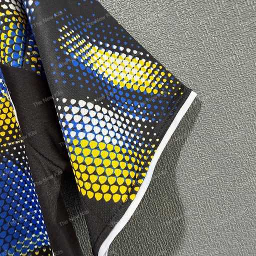 Dark Base, Electric Pop: The jersey features a deep black base that serves as a canvas for an aggressive, abstract pattern. This pattern integrates bursts of electric blue and sharp yellow, creating a stunning visual contrast that demands attention.