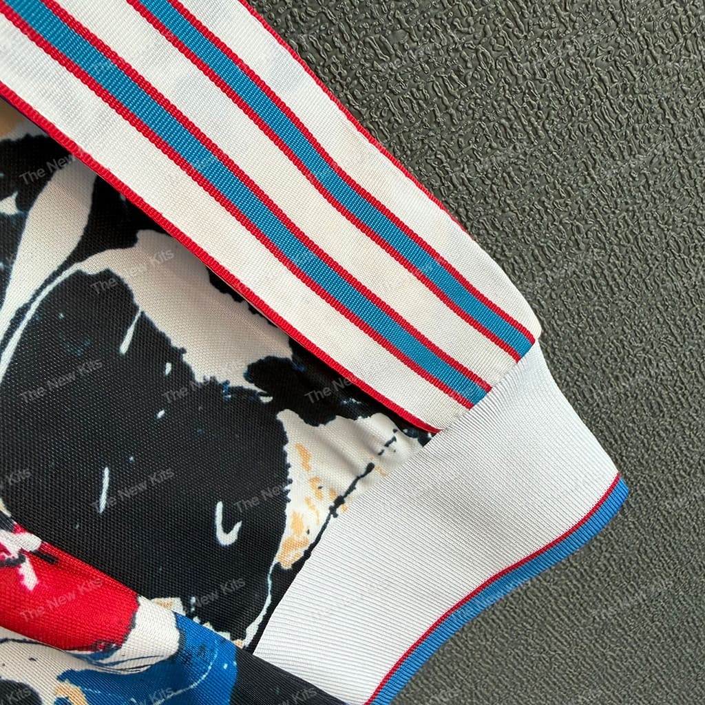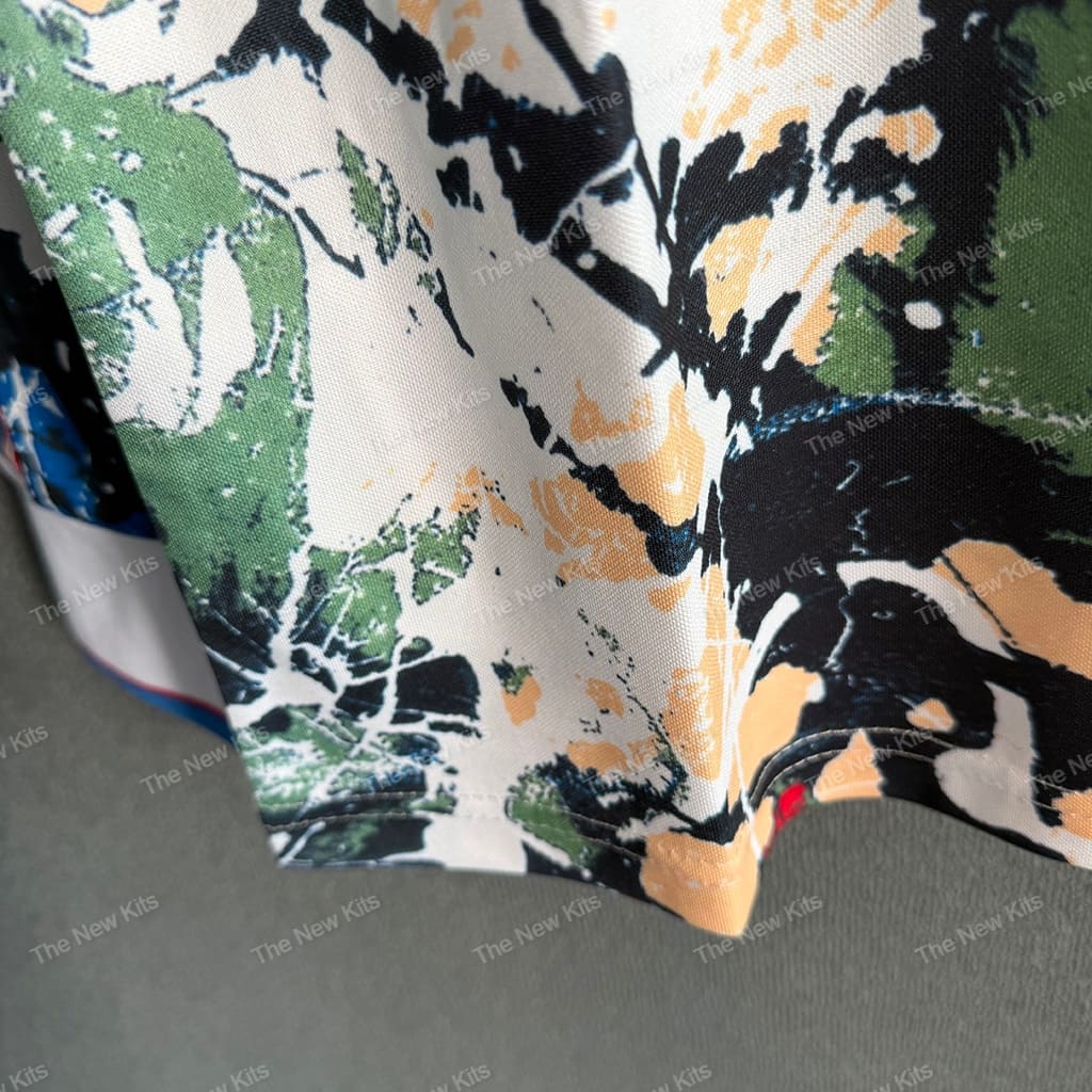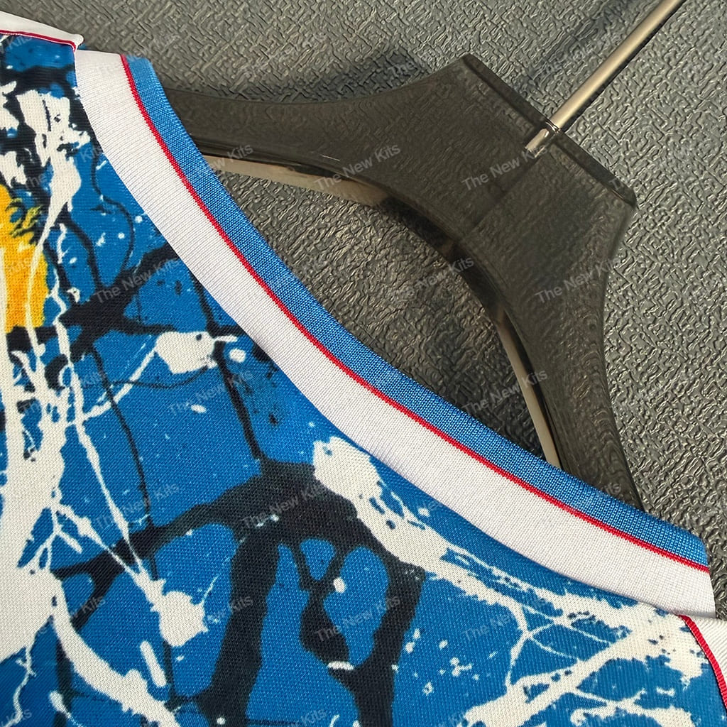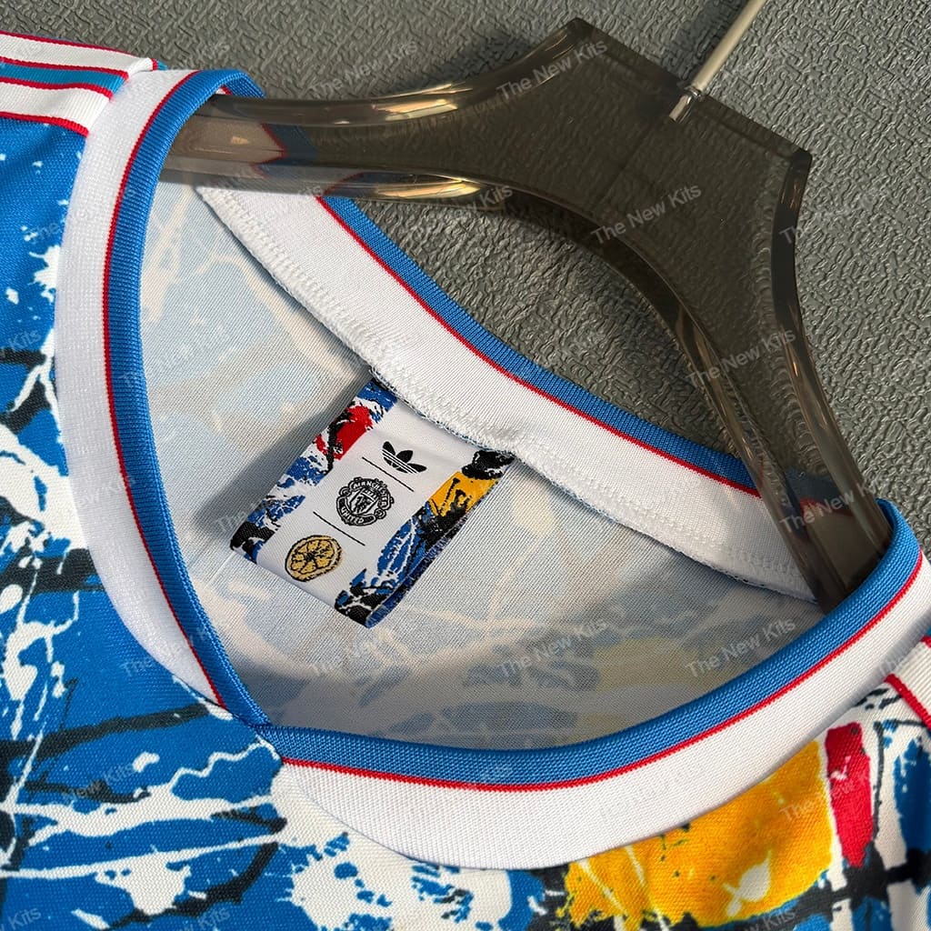 The jersey features a bold paint-splatter design across the entire front and sleeves. Vibrant splashes of blue, yellow, and red create a dynamic visual energy. This artistic pattern honors the “Madchester” era and the club’s deep cultural roots. Furthermore, the red Trefoil logo on the right chest adds a premium vintage touch.