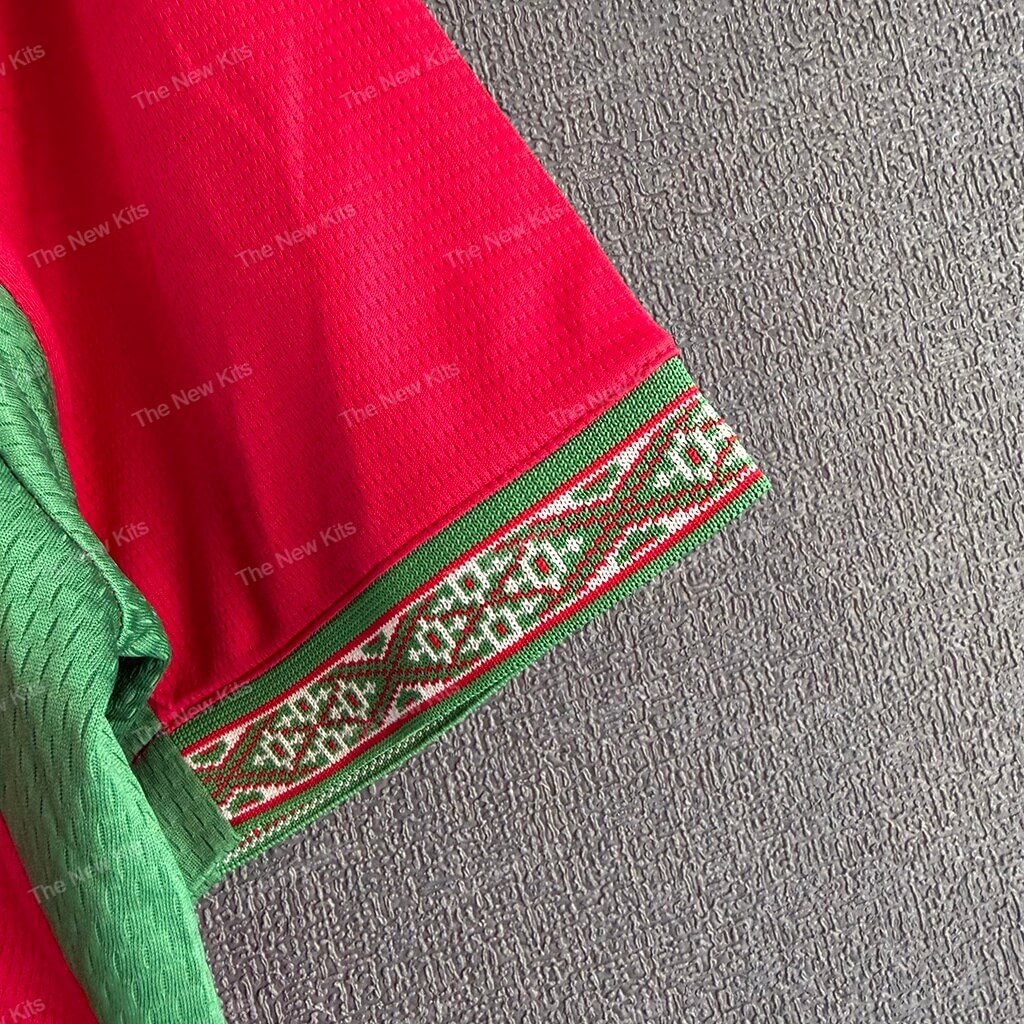 The morocco national football team kit features a vibrant red base that represents the national flag and the team’s identity. This version introduces a refined look with green side panels and thoughtful cultural details. Furthermore, a closer look reveals unique decorative patterns on the collar and sleeve cuffs.