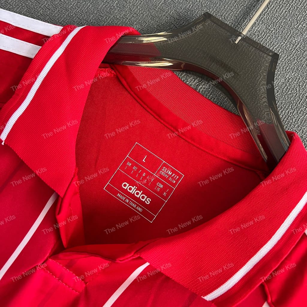 This Nottingham Forest FC kit features a rich red base complemented by clean white vertical pinstripes — a refined nod to heritage designs. The minimalist color scheme is timeless, while the inclusion of a traditional-style collar elevates the look with a tailored finish worthy of a historic club like Forest.