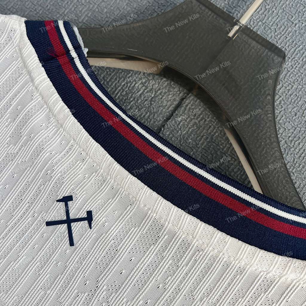 Travel in style with the new west ham united kit for 2025/26. This away player version shirt pairs a clean white base with deep navy branding and subtle claret-and-navy pin-stripe trim on the collar and cuffs. A tonal woven texture runs through the body, while the monochrome Hammers crest sits proudly over the heart.
