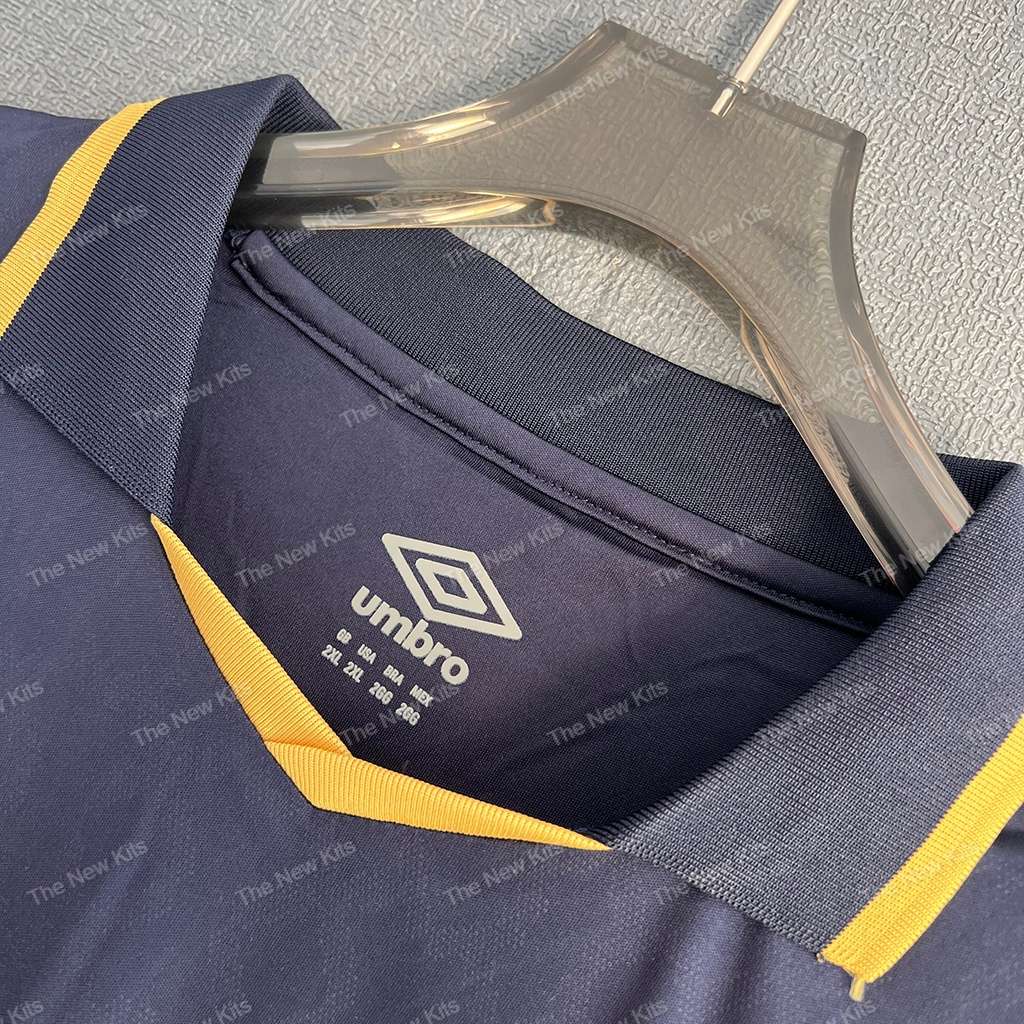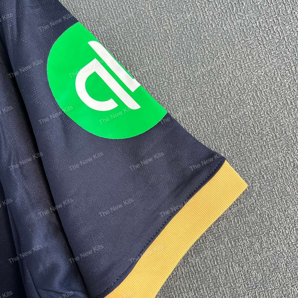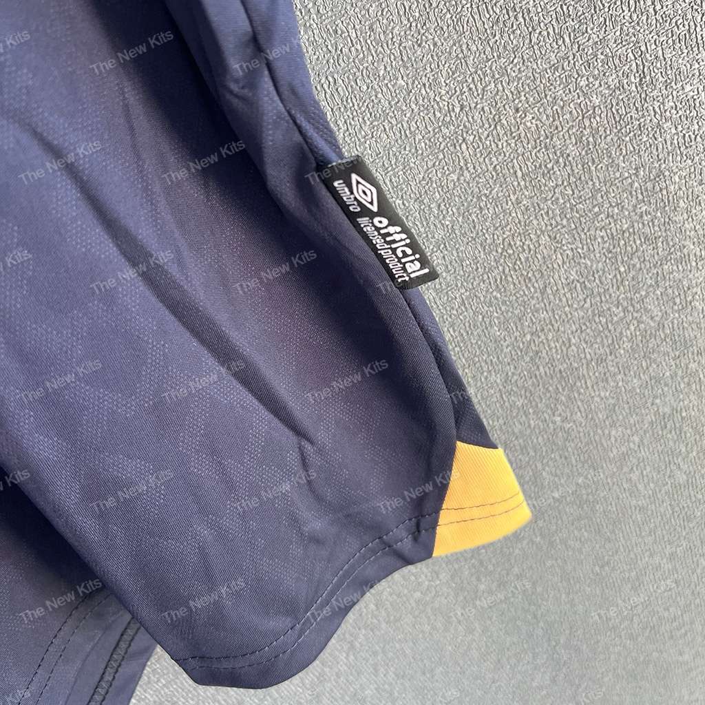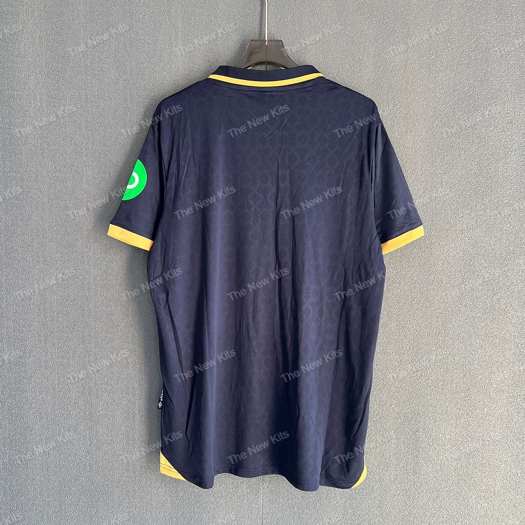 West Ham’s third look for 25/26 goes minimalist and confident. The navy canvas lets the gold accents lead—collar tips, sleeve edges, and side vents deliver subtle color pops. The mono badge leans into heritage while keeping things sleek, so the west ham shirt pairs as well with denim as it does with training shorts.